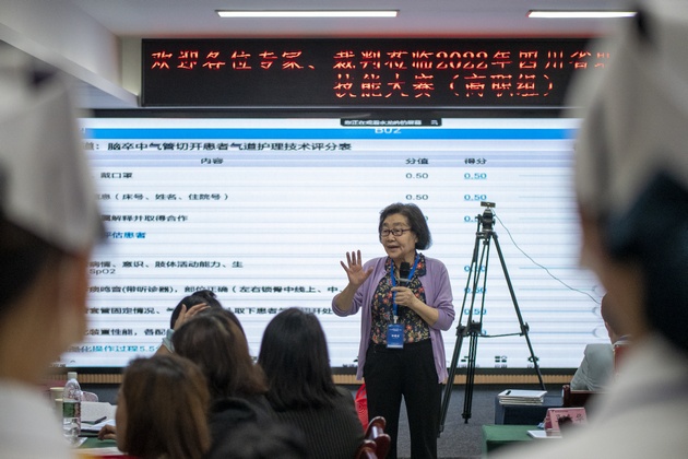 据悉本次大赛的裁判由来自行业和职业院校的27 位知名专家组成,裁判们敬业高效、公正执裁、精益求精,确保了本次大赛的圆满成功。在大赛闭幕总结会上,四川省人民医院外科科护士长、主任护师马青华和四川省肿瘤医院重症监护室总护士长、主任护师向明芳分别就第一、二赛道赛项做了精彩点评,她们强调对于病人,要做到“始于其乎,终于其乎”,在肯定参赛选手突出表现的同时,也详细指出了存在的不足与缺点并提出了具体建议。南丁格尔奖获得者、大赛仲裁组组长、四川大学华西医院医院管理研究所成翼娟则对大赛作了全面系统的点评。她高度评价了太阳成集团tyc33455cc作为承办单位在准备设施上的实力以及对本次大赛的精心筹备和安排,并提出了宝贵的指导建议。她指出,高职护理专业人才培养要与新时代职业教育发展深度融合,注重对员工评判性思维、心理素质、职业安全防护等能力的培养,以赛促教、以赛促学、以赛促改,培养更多优秀的高素质护理技术技能人才。
