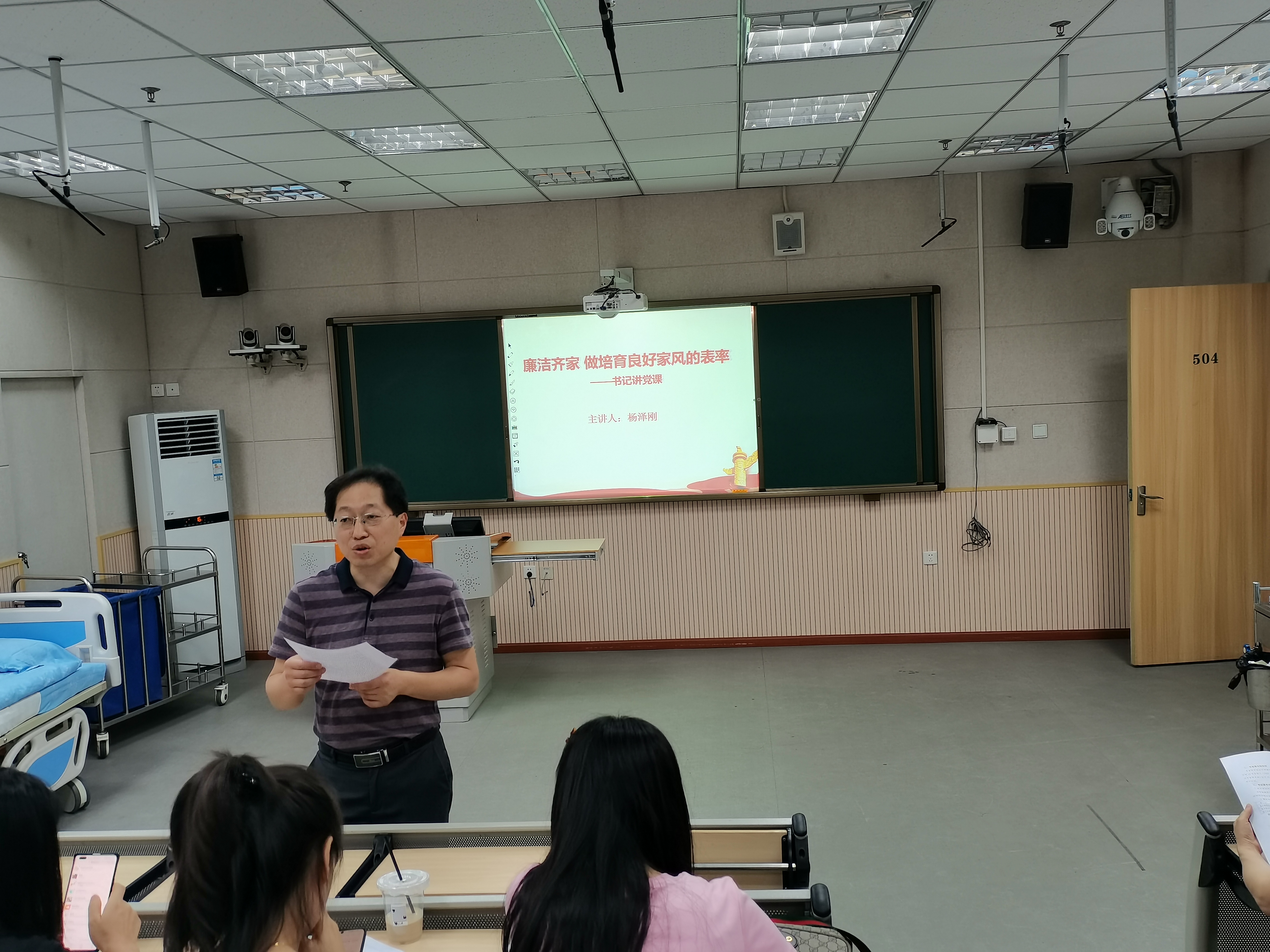 6月21日下午,护理公司党总支书记杨泽刚在青年路校区实训楼504教室为太阳成集团tyc33455cc全体教职工开展了主题为《廉洁齐家 做培育良好家风的表率》的专题党课。