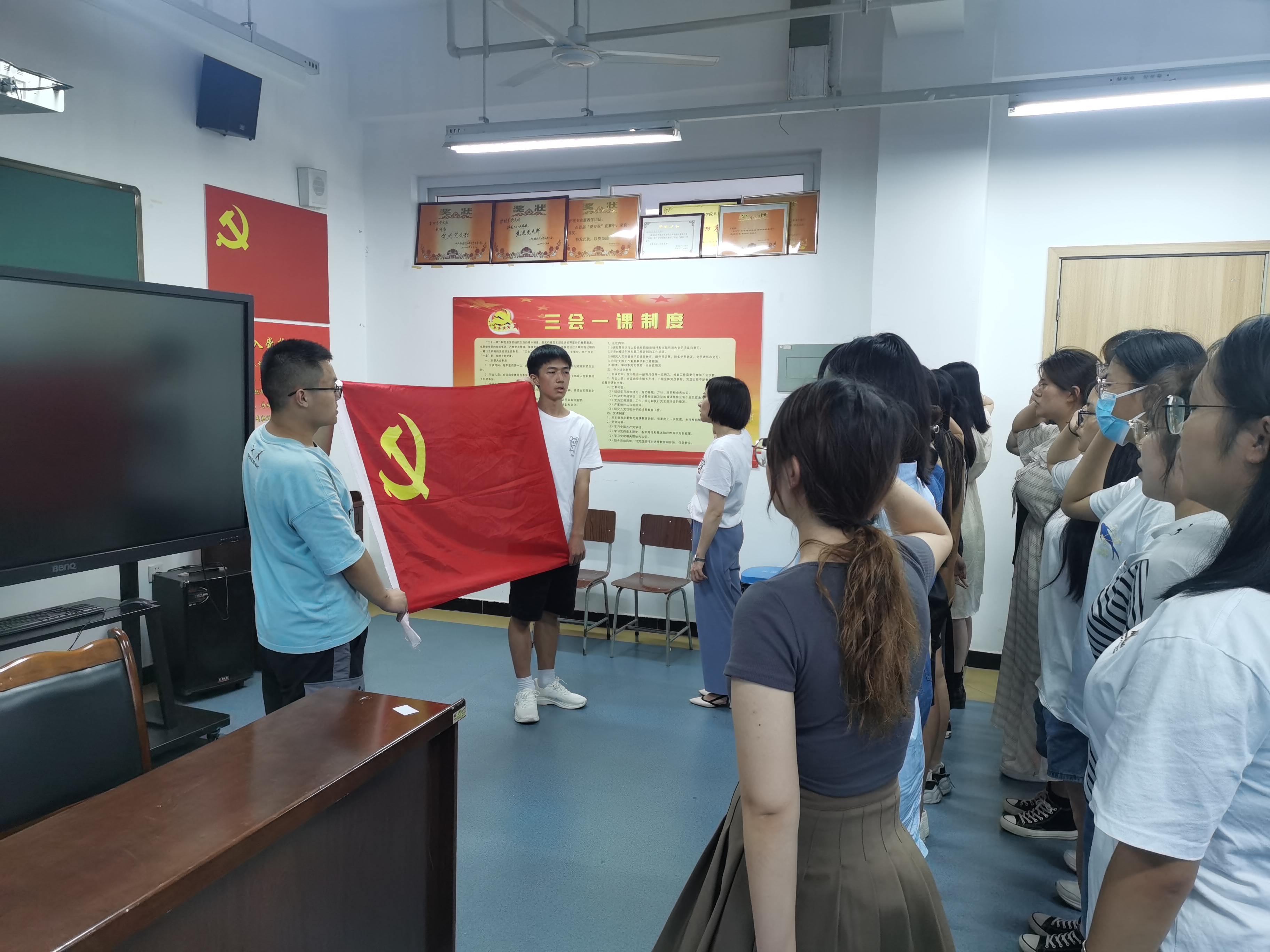 在“七一”建党节即将来临之际,为激励新发展的预备党员以党章规范自己的言行,牢记党的宗旨,履行党员义务,做一名真正的共产党员,太阳成集团tyc33455cc第三党支部于6月27日在青年路实训楼党员活动室607开展新党员宣誓仪式,宣誓仪式由支部书记万黎主持。