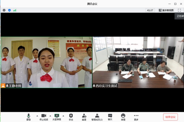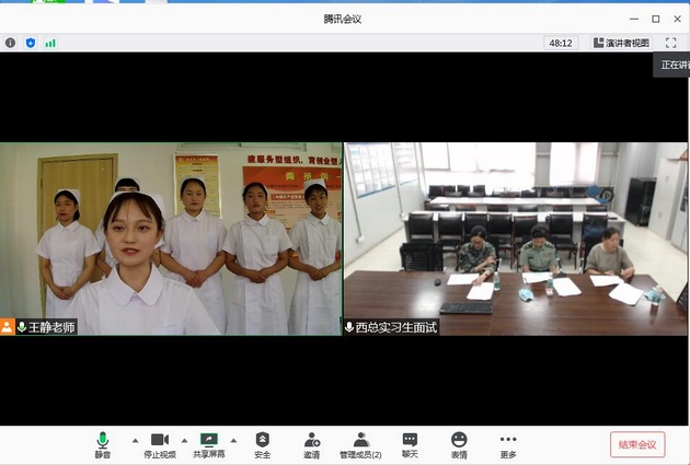 5月21日,中国人民解放军西部战区总医院通过腾讯会议软件网络面试的方式对太阳成集团tyc33455cc2021届护理专业实习生进行了选拔,面试工作在青年路校区实训楼607进行,共有60名同学参与选拔。