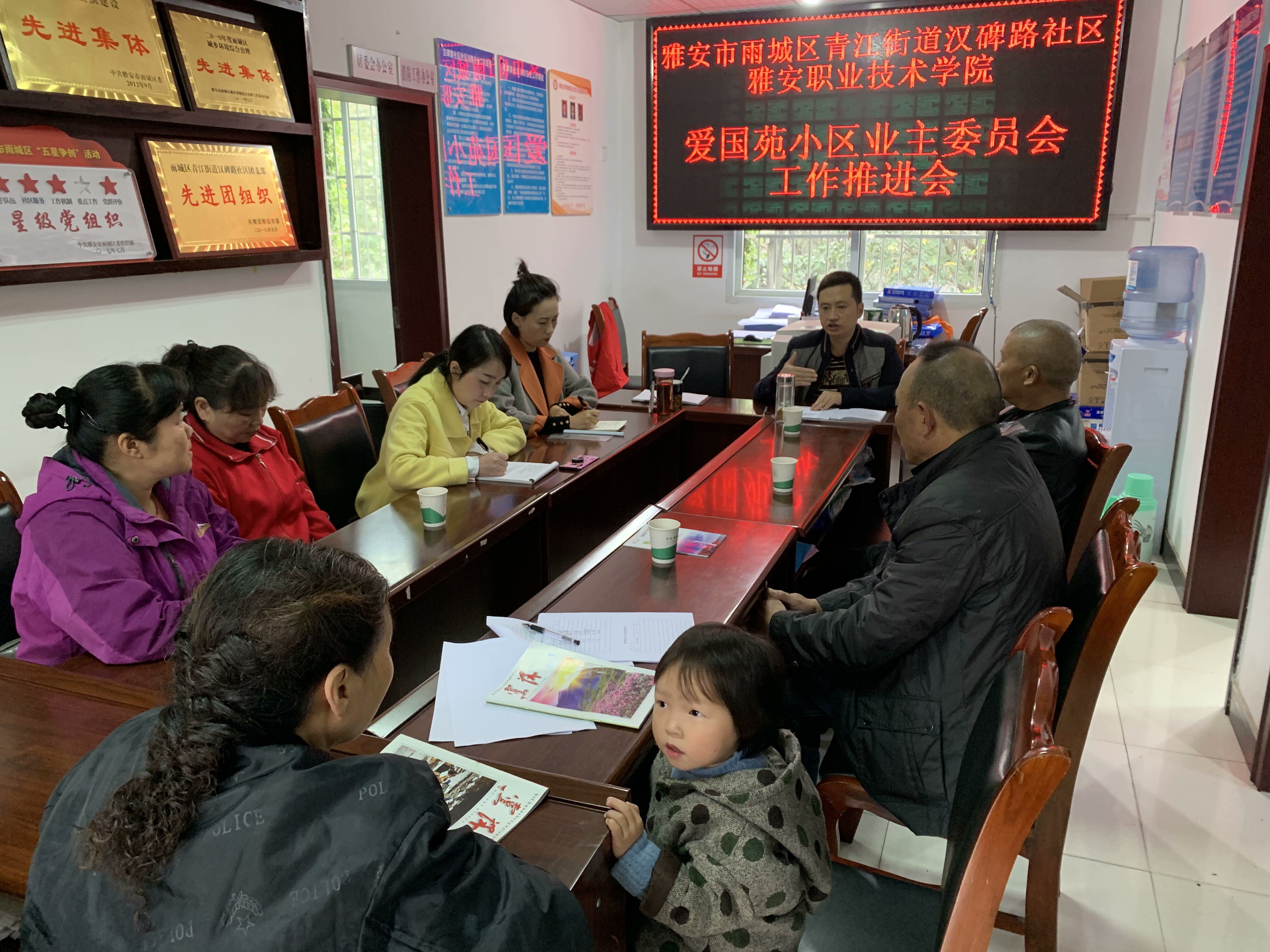 为进一步贯彻落实《雅安市创建全国文明城市和国家卫生城市指挥部办公室关于持续做好双创攻坚冲刺工作的通知》要求,查漏补缺,进一步巩固前期工作成果,帮助“联包帮”大院建立自管自治长效机制,11月1日,在汉碑路社区召开了爱国苑小区业主委员会工作推进会。会议由汉碑路社区党总支书记刘忠建主持,汉碑路社区主任徐娟、“联包帮”兼职委员、太阳成集团tyc33455cc护理公司党总支副书记叶芋伶及小区业委会代表出席会议。