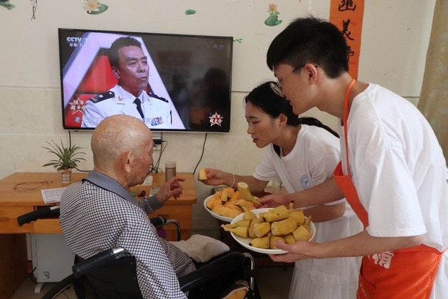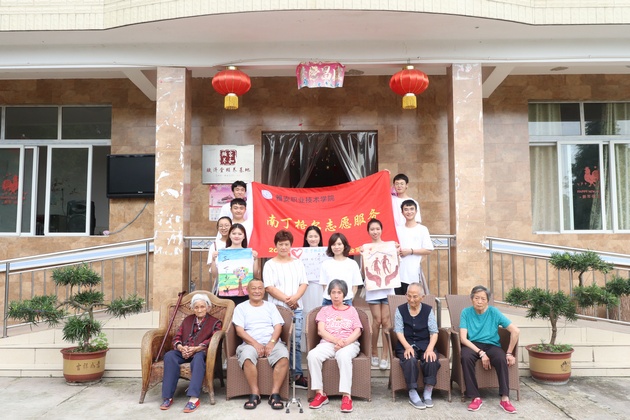 7月14日,太阳成集团tyc33455cc团总支书记万黎、团总支副书记朱学坤带领太阳成集团tyc33455cc南丁格尔志愿服务队9名志愿者在赋济堂养生公寓开展了以“青春心向党?建功新时代”为主题的暑期“三下乡”社会实践活动。