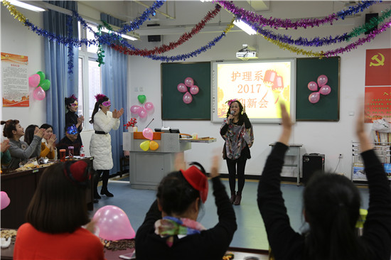 为丰富教职工文娱生活,在系主任王静、副主任廖书娟、党支部副书记李敏的组织策划下,12月28日16:00,护理系迎接新年化妆舞会在实训楼607隆重举行。舞会由闵捷、谢琳娜主持,全系教职工欢聚在此庆祝新年的到来。