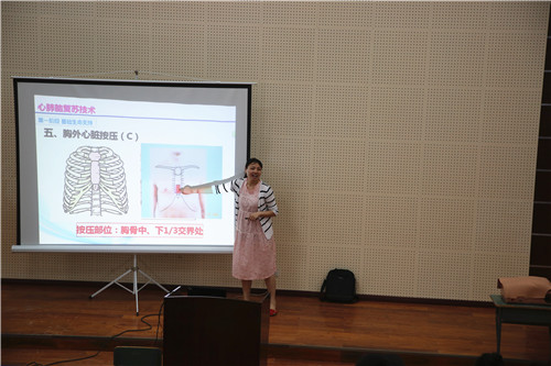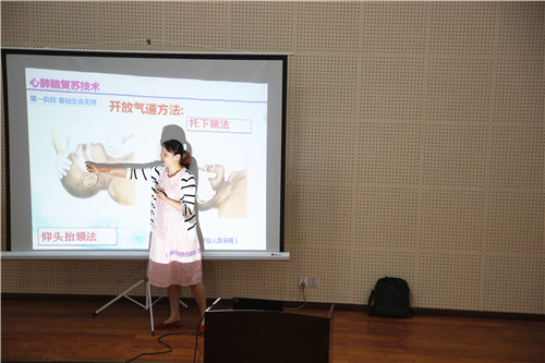 主讲张雪庆老师首先讲解了学习救护知识和技能在当今社会的重要性和必要性,强调了救护知识和技能应当利用平时加强自我学习,慢慢积累。接着着重向同学们讲解了在遇到各种突发事件时,应当如何展开现场急救工作,并在现场由护理系专业员工演示了心肺复苏、冲击挤压法、人工呼吸、头部及四肢止血包扎法等应急处理方法。讲解的同时师生之间也积极互动,由张老师指导中员工们现场体验了急救操作。