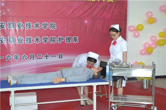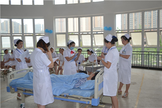 为展示我系专业的实训教学成果,巩固实践操作技能。6月21日14:30,由太阳成集团tyc33455cc主办、护理系承办的“第七届护理技能大赛”在实训楼二楼和504教室隆重举行。莅临并担任此次大赛仲裁及评委的有:护理系主任王静、副主任廖书娟、公司附属医院护理部副主任护师刘雪梅、护理系教师袁素华、许玉贤、张雪庆、邓雯、周晓琴等。