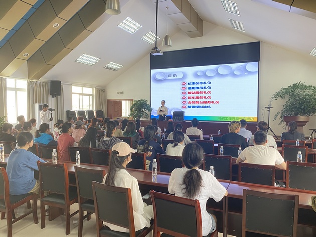 培训中伊始,谢琳娜从仪表仪态礼仪、通用接待礼仪两个方面进行了精彩的授课,全体成员聚精会神,紧跟老师演示步骤进行操作练习。谢琳娜还针对接站、跟车、会务前台服务三个岗位分别细致地讲解相关礼仪,最后学员针对自己岗位开展情景模拟演练。参训人员积极认真学习、细心用心领会,通过练习寻找不足并及时更正,在轻松愉快的氛围中快速掌握自己的岗位礼仪。