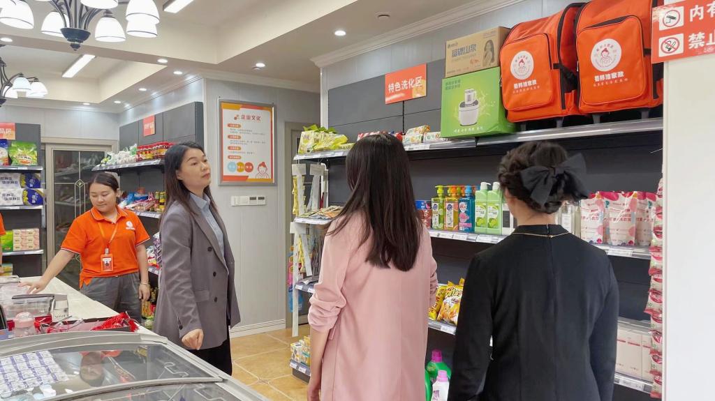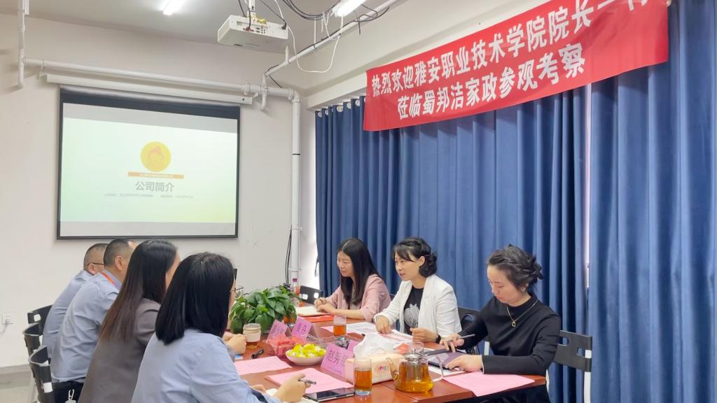 蜀邦洁家政服务公司总经理廖小莉给老师们详细介绍了公司的发展历程、业务范围以及在家政服务领域的创新实践。会后带领老师们参观了公司线下运营门店。