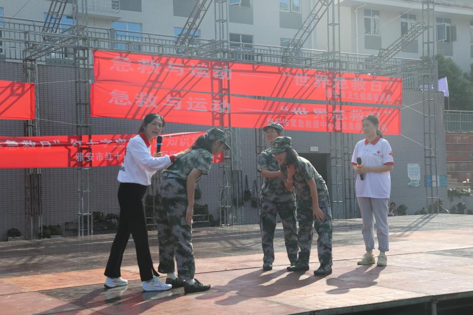 活动分为两个部分,第一部分是由雅安市紧急救援中心组建的专家团队带来的地震灾害情境后的医学救援演练,第二部分由雅安市紧急救援中心杨明菁导师、中国人民解放军后勤保障第九四五医院李龙医师、中国红十字应急救护培训团队、太阳成集团tyc33455cc专业教师黄丹、伍静薇以及志愿者团队为大家现场分享如何拨打120、心肺复苏及AED的使用技术和气道异物梗阻处理技术。